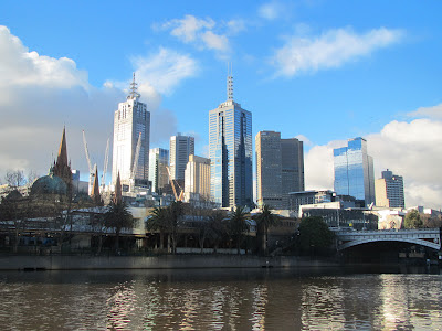 Back in Melbourne the sun shone. I bang on about this city every time we're here but I just think it's magic. We rode on jam-packed rattling trams from one sparkling shopping district to the next and drank coffee on the Yarra River's Southbank. A rower glided under the bridge. Food smells from around the world wafted out of the food court. Television screens blinked at us from behind the counters and the distinct colours of footy scarves began to appear around the necks of patrons as day shuffled into evening.